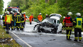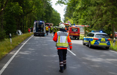 Die Versorgung der Unfallopfer übernahmen dann die eintreffenden DRK-Einsatzkräfte zusammen mit vier Notärzten. Zusätzlich übernahm ein Leitender Notarzt die sogenannte Sichtung der Patienten, während Brandschützer unter Atemschutz die Löschmaßnahmen am Unfallwagen fortführten.