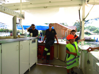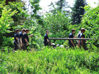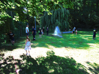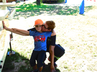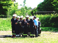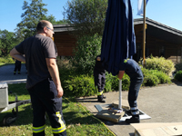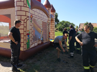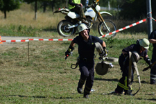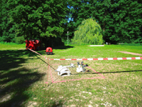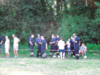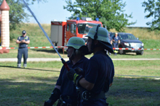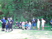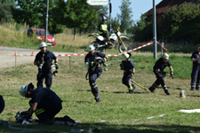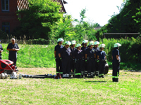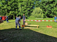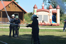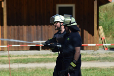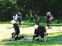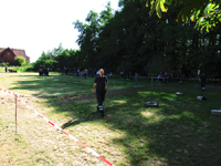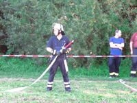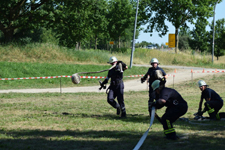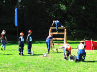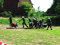Hier wird ein Löschangriff über Hindernisse mit drei Strahlrohren simuliert. Diese Übung steht der, der Erwachsenen in keiner Weise nach.
