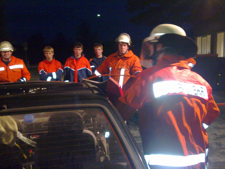 Nun sollten wir die Schere, Spreizer und Stempel auch selbst mal ausprobieren. Ein kaputtes Auto stand für uns bereit. Unter fachkundiger Anweisung sägten wir zuerst die Frontscheibe heraus und entfernten die Seitenscheiben. Dann ging es um die beiden Autotüren, die mit dem Spreizer quasi ausgehebelt wurden. Platz zum Retten einer möglicherweise eingeklemmten Person hatten wir somit schon mal. Aber es ging trotzdem weiter. Wir zerschnitten mit der Schere die A-, B- und C-Säulen um dann das Dach komplett abheben zu können. Nun hatten wir ein schickes Kabrio!