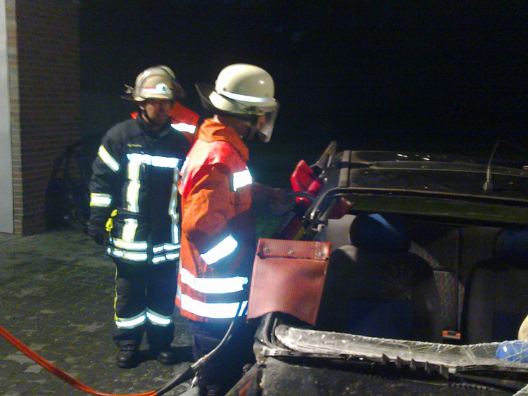 Nun sollten wir die Schere, Spreizer und Stempel auch selbst mal ausprobieren. Ein kaputtes Auto stand für uns bereit. Unter fachkundiger Anweisung sägten wir zuerst die Frontscheibe heraus und entfernten die Seitenscheiben. Dann ging es um die beiden Autotüren, die mit dem Spreizer quasi ausgehebelt wurden. Platz zum Retten einer möglicherweise eingeklemmten Person hatten wir somit schon mal. Aber es ging trotzdem weiter. Wir zerschnitten mit der Schere die A-, B- und C-Säulen um dann das Dach komplett abheben zu können. Nun hatten wir ein schickes Kabrio!