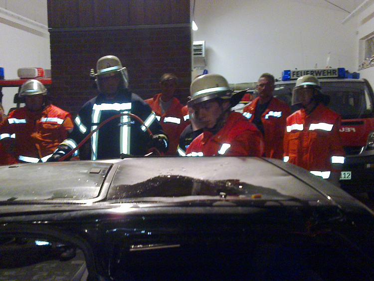 Nun sollten wir die Schere, Spreizer und Stempel auch selbst mal ausprobieren. Ein kaputtes Auto stand für uns bereit. Unter fachkundiger Anweisung sägten wir zuerst die Frontscheibe heraus und entfernten die Seitenscheiben. Dann ging es um die beiden Autotüren, die mit dem Spreizer quasi ausgehebelt wurden. Platz zum Retten einer möglicherweise eingeklemmten Person hatten wir somit schon mal. Aber es ging trotzdem weiter. Wir zerschnitten mit der Schere die A-, B- und C-Säulen um dann das Dach komplett abheben zu können. Nun hatten wir ein schickes Kabrio!
