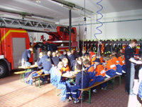 Am Samstagnachmittag ging es dann zum Gerätehaus der Feuerwehr Wyk, wo wir mit Kakao, Kaffee, Kuchen, Keksen und Cola empfangen wurden. Natürlich mussten wir alle auch erst einmal ausführlich das Gerätehaus, die Ausrüstung und Fahrzeuge in Augenschein nehmen. Bei dem anschließenden ruhigen „Klönschnack“ durfte dann auch eine Einladung an die Jugendfeuerwehren Boldixum und Wyk zum Gegenbesuch bei uns nicht fehlen. Der Samstag endet dann selbstverständlich wieder mit einem gemeinsamen Besuch auf dem Jahrmarkt und selbstverständlich gab es wieder so einige Probleme mit der Nachtruhe. Dies merkten die Betreuer dann auch an den müden Gesichtern am Sonntagmorgen. Die waren jedoch schnell verflogen als wir die Indoorspielanlage des Fun-Park-Föhr erreicht hatten. In einer großen Halle luden Rutschen, große Hüpfburg, Klettergerüste, Softballkanonen, Streetsoccer, Basketballfelder und und und zu reichlich Beschäftigung ein.